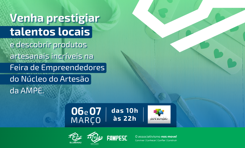 Está chegando mais uma edição da Feira de Artesanato do Núcleo do Artesão da AMPE Blumenau, no Shopping Park Europeu! Dias: 06 e 07 de marçoHorário: das 10h às 22hLocal: Shopping Park Europeu Venha prestigiar os talentosos artesãos locais e levar para casa peças únicas, cheias de criatividade, cultura e