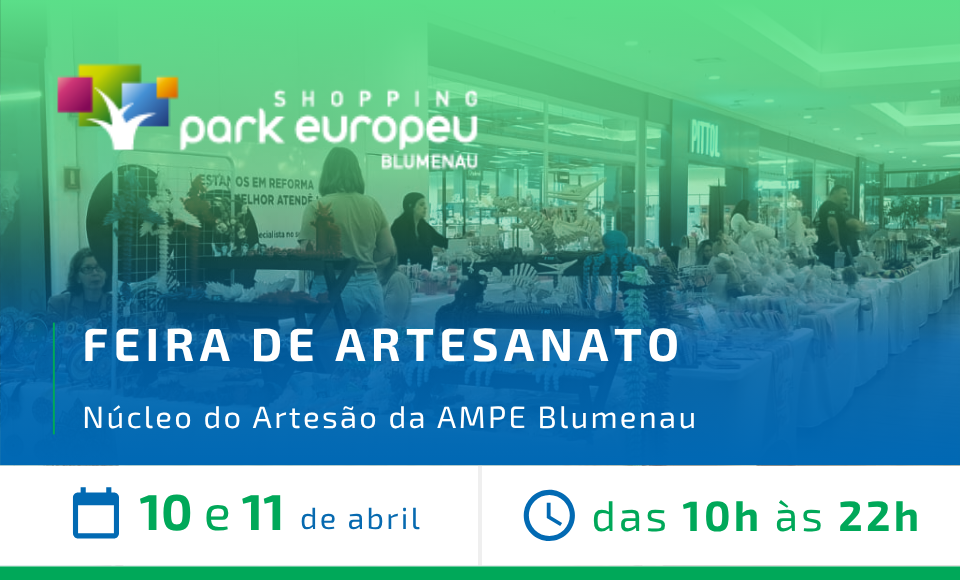 A Feira do Núcleo do Artesão da AMPE Blumenau chega ao Shopping Park Europeu com uma variedade incrível de produtos artesanais, feitos à mão por empreendedores locais que transformam dedicação em peças únicas.