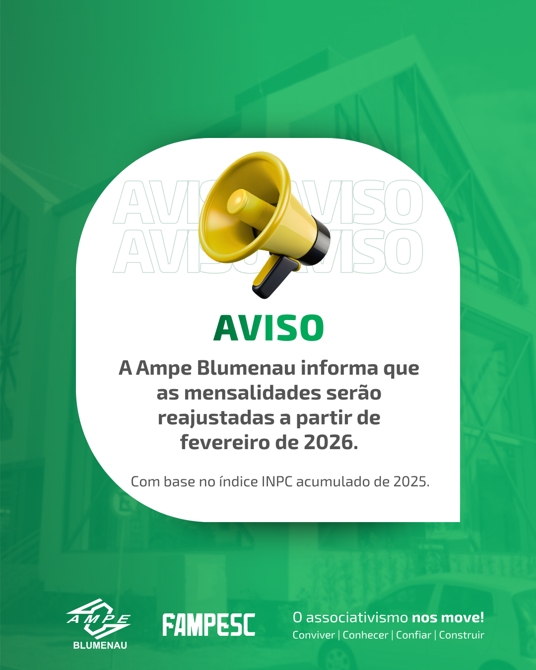 A AMPE Blumenau informa que conforme nosso estatuto, devidamente aprovado pelo Conselho Deliberativo em reunião realizada no dia 28/01/2026, as mensalidades dos associados serão corrigidas a partir de fevereiro de 2026, com base no índice INPC acumulado de 2025 (3,897870%). Desta forma, o valor da mensalidade será atualizado de R$ 80,57 para R$ 83,71.
