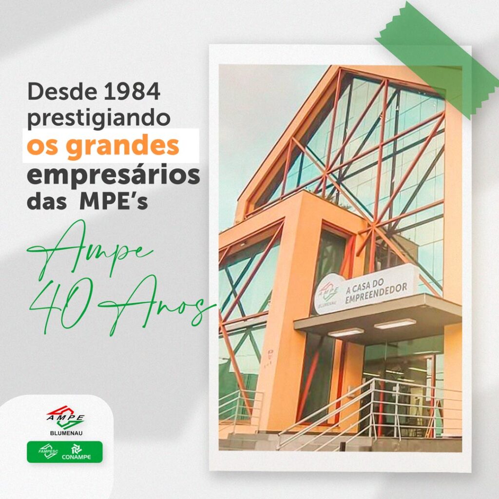 Hoje esse guarda-chuva conta com um Ministério voltado ao segmento, e como faróis a nos orientarem existem as Federações Estaduais, duas Confederações em Brasília, e as centenas de associações como a Ampe Blumenau, sempre alertas e atuantes. Vale lembrar que por força de legislações específicas, e homenageando nossa entidade, 29 de março é considerado o Dia Municipal da Micro e Pequena Empresa em Blumenau e o Dia Estadual desse segmento em Santa Catarina, o que muito nos orgulha.