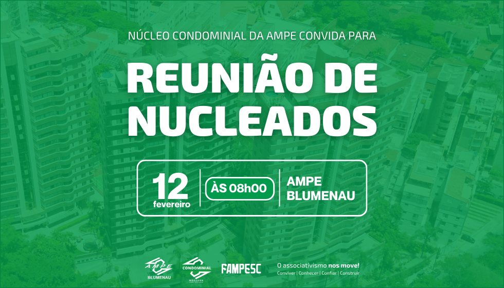 O Núcleo Condominial da AMPE Blumenau realizará a reunião de Nucleados no dia 12 de fevereiro, às 8h. A reunião acontecerá na sede da AMPE,