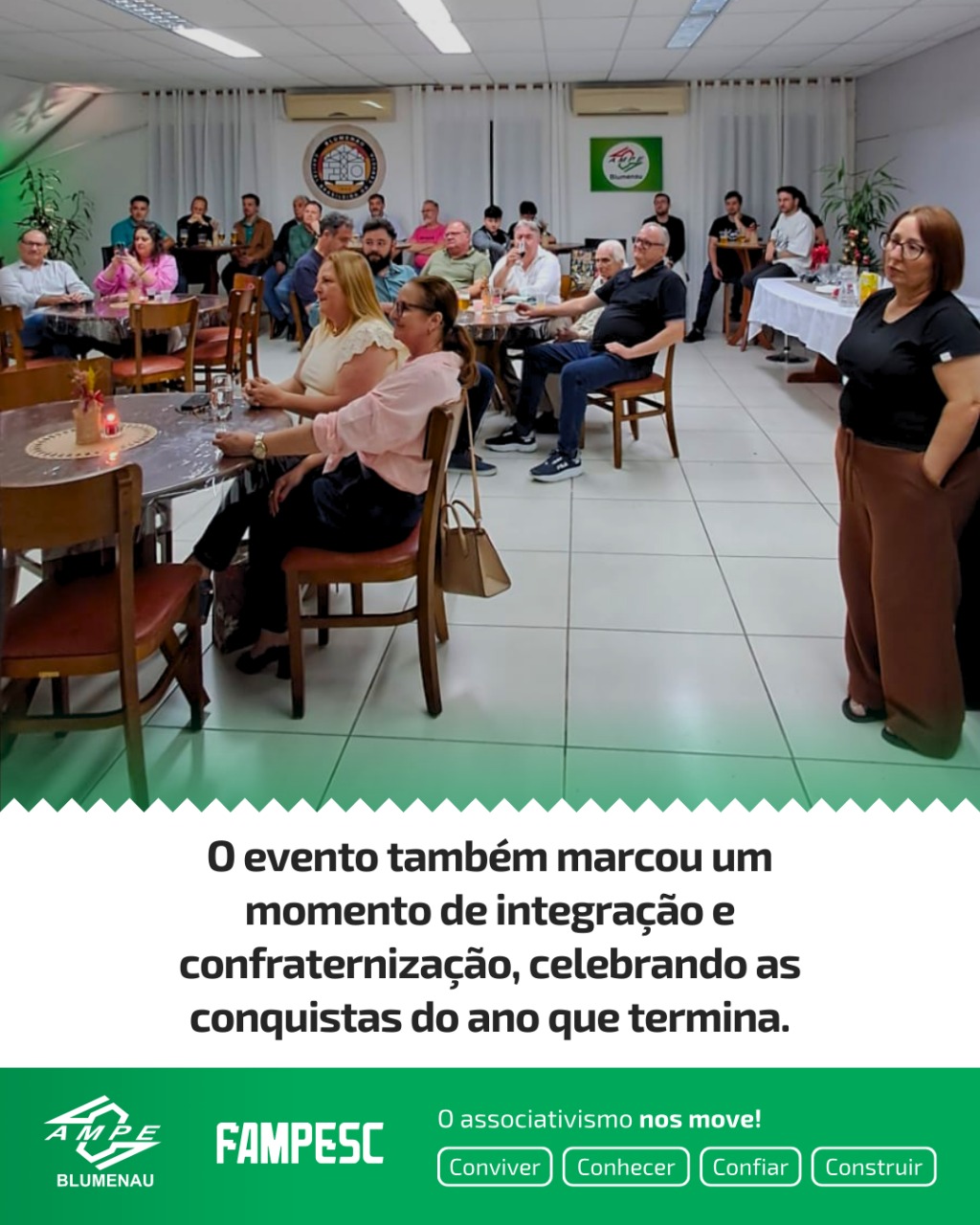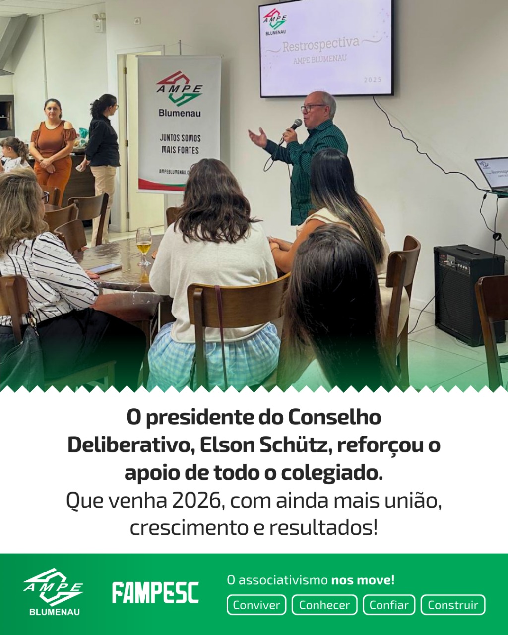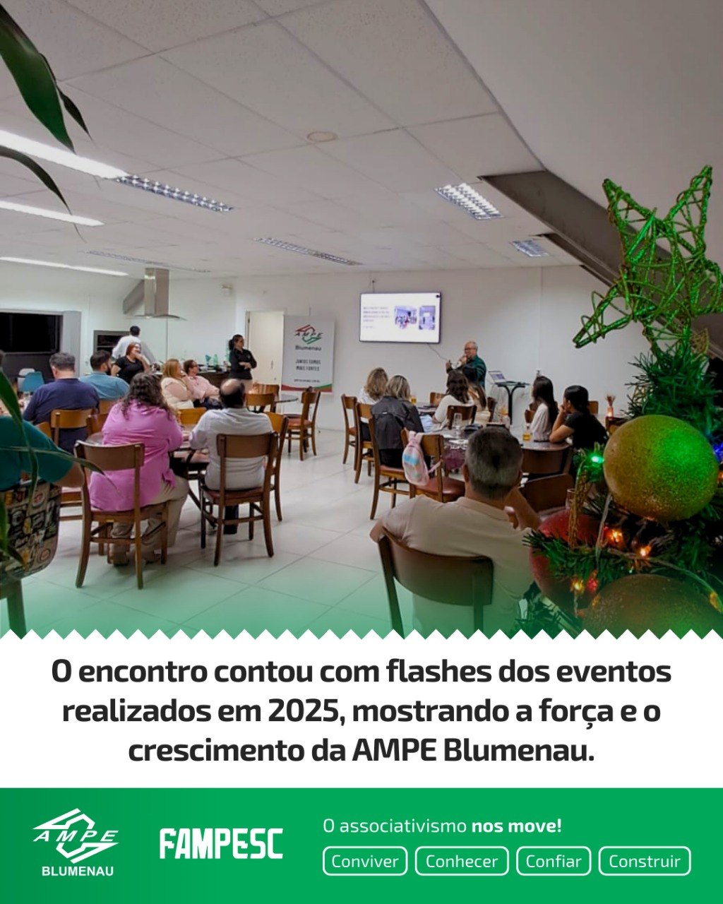 A AMPE Blumenau realizou, no dia 1° de dezembro, um encontro da Diretoria Executiva com os integrantes do Conselho Deliberativo, do Conselho Fiscal e Coordenadores dos Núcleos Setoriais, com a finalidade de apresentar um Relatório das atividades desenvolvidas no decorrer de 2025.