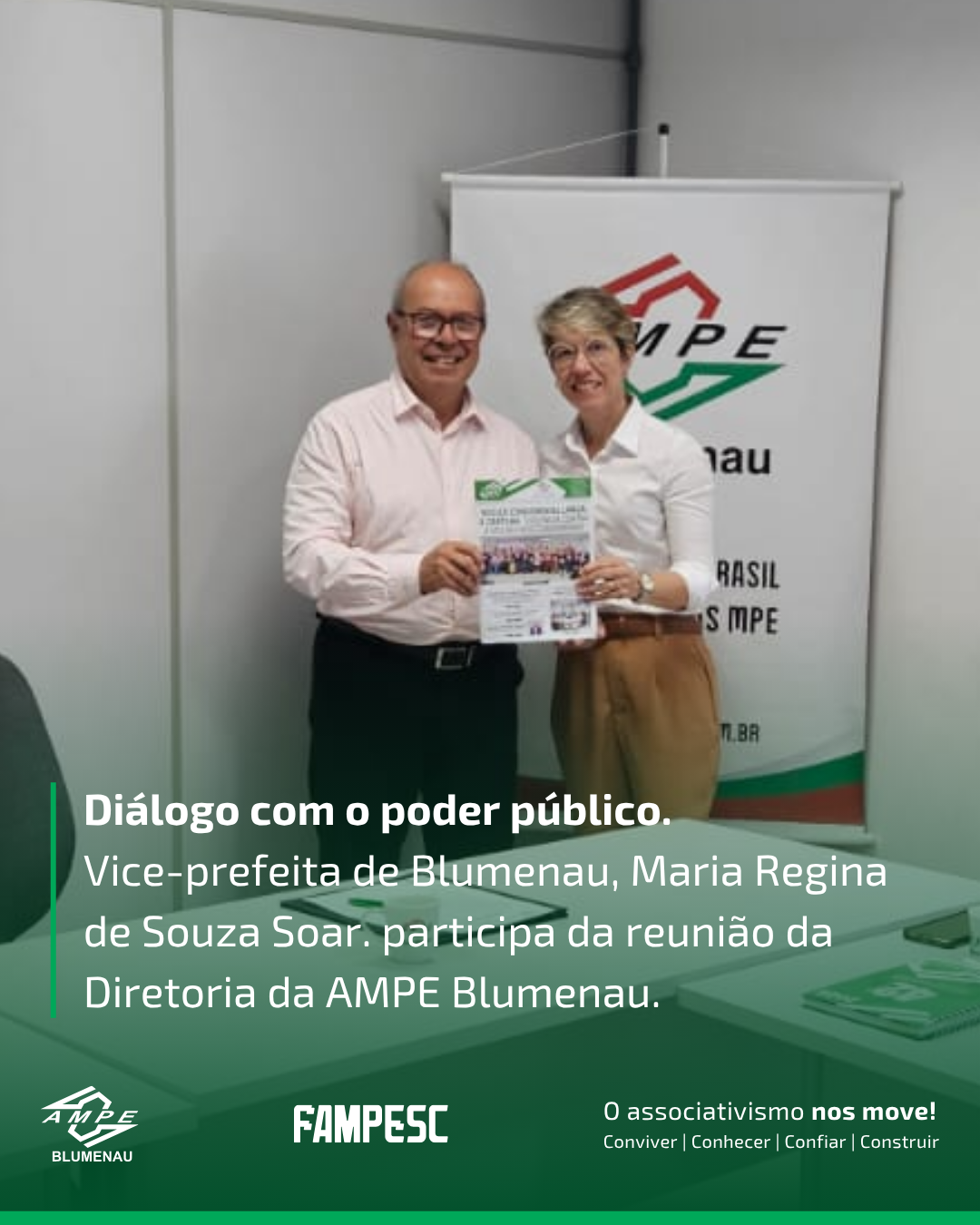Maria Regina de Souza Soar, pela segunda vez vice-prefeita de Blumenau, atendendo a convite do presidente da AMPE Blumenau, Demócrates Schmitd, participou da reunião de Diretoria da entidade realizada no dia 8 de abril corrente.